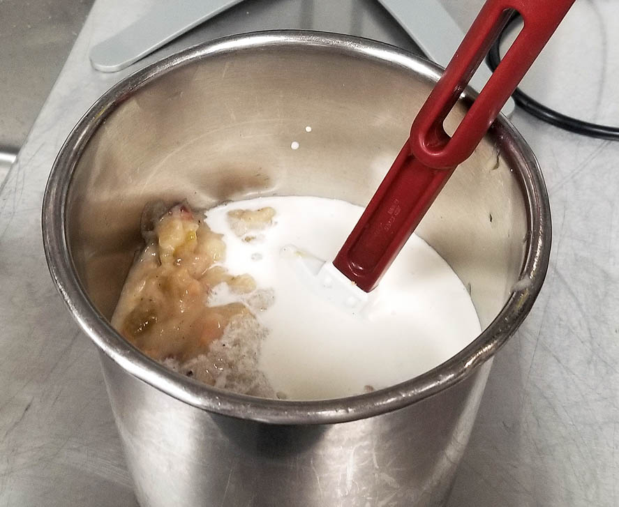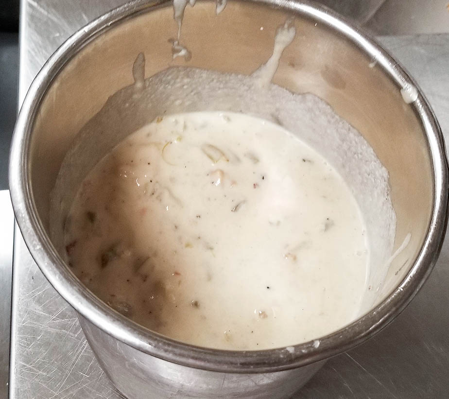 Prepare the cold chowder base by combining 64 oz. of base with 6 oz. of cream. Mix well to combine. Refrigerate.